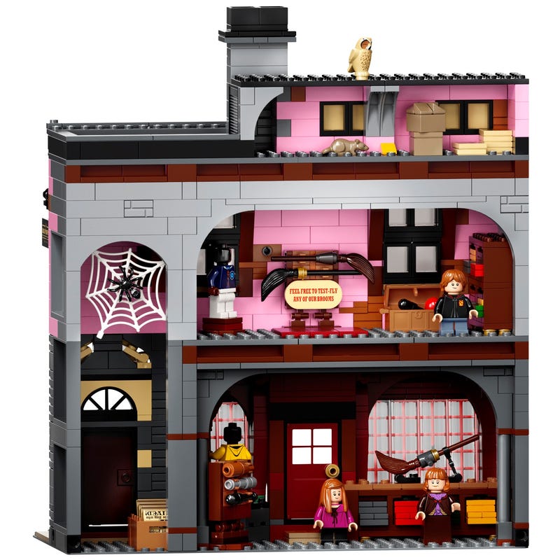 Measuring more than a meter wide, the impressive model captures the scale and ambience of the bustling magic-supplies hub. Behind magnificent facades lie intriguing interiors, fascinating features and familiar characters. Check out the wands at Ollivanders; drop in on Gilderoy Lockhart's book-signing event at Flourish & Blotts bookseller; obtain a love potion from Weasleys' Wizard Wheezes; and peruse the products and paraphernalia at Scribbulus Writing Implements, Quality Quidditch Supplies, Florean Fortescue's Ice Cream Parlor and the Daily Prophet.