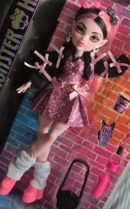 - La poupée Draculaura est également livrée avec des accessoires de coiffure et de narration : un sac à main en forme de crâne, des lunettes de soleil en forme de cœur, du rouge à lèvres, un téléphone iCoffin, un thermos de chocolat chaud, des ramens RIP et une friandise en forme de chauve-souris🎀
