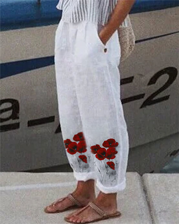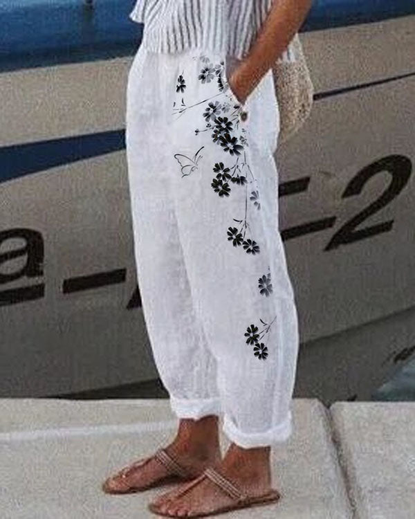 Casual Loosen Linen & cotton Pockets Floral Pants