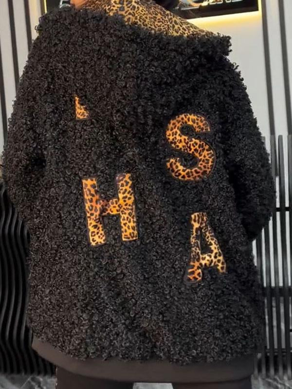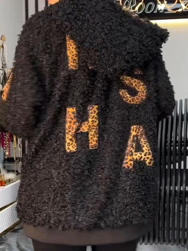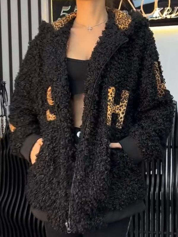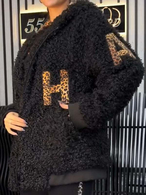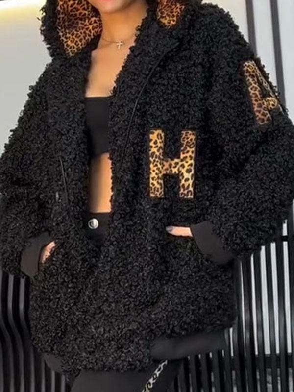 Women's Leopard Print Plush Long Sleeve Hooded Coat